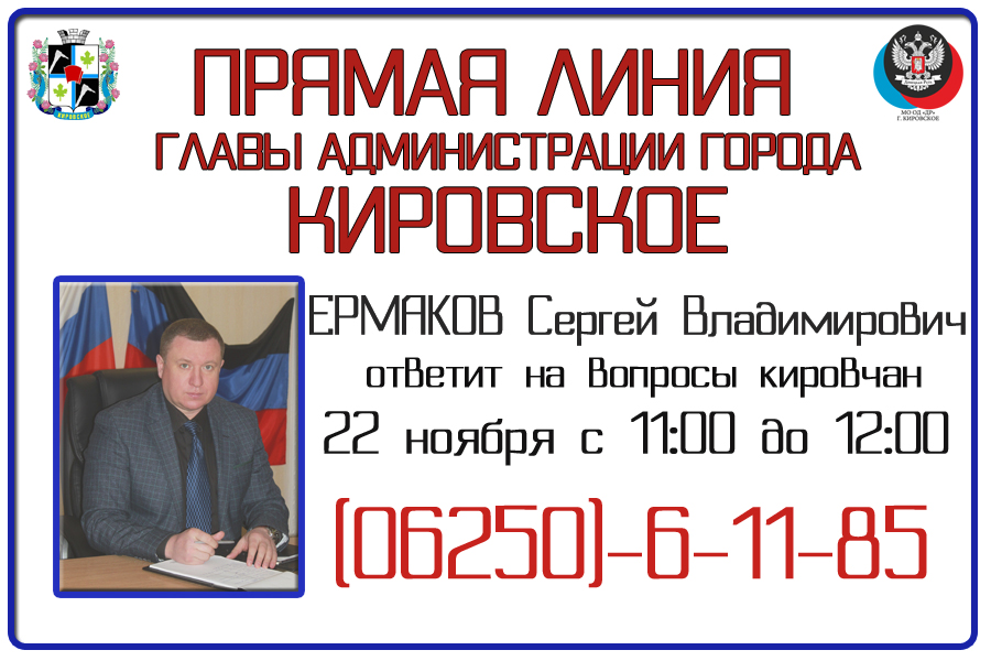 15 ноября 2021 г. с 11.00 до 12.00 состоится «прямая линия» телефонной связи с главой администрации города Кировское, секретарем местного отделения Общественного Движения «Донецкая Республика» Читать далее …
