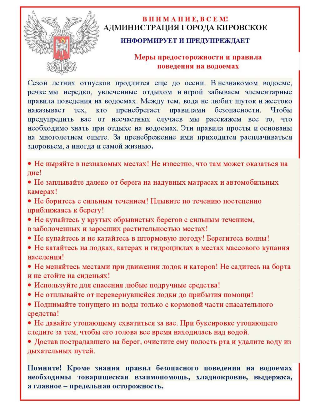 Помните! Кроме знания правил безопасного поведения на водоемах необходимы товарищеская взаимопомощь, хладнокровие, выдержка, а главное – предельная осторожность.