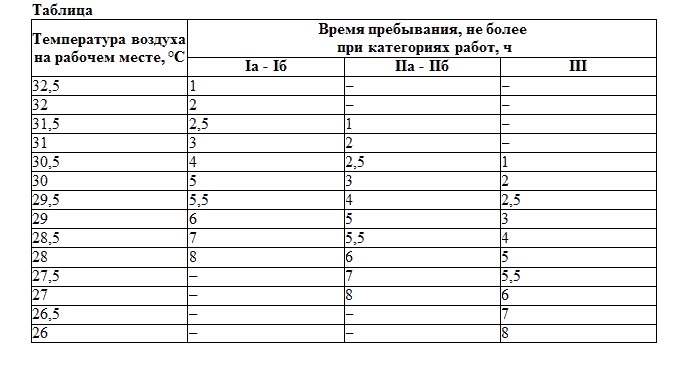 Возможное время пребывания на рабочих местах при температуре воздуха выше допустимых величин зависит от категории работ. Они также, как и в Украине, выделены в 3 основные группы.