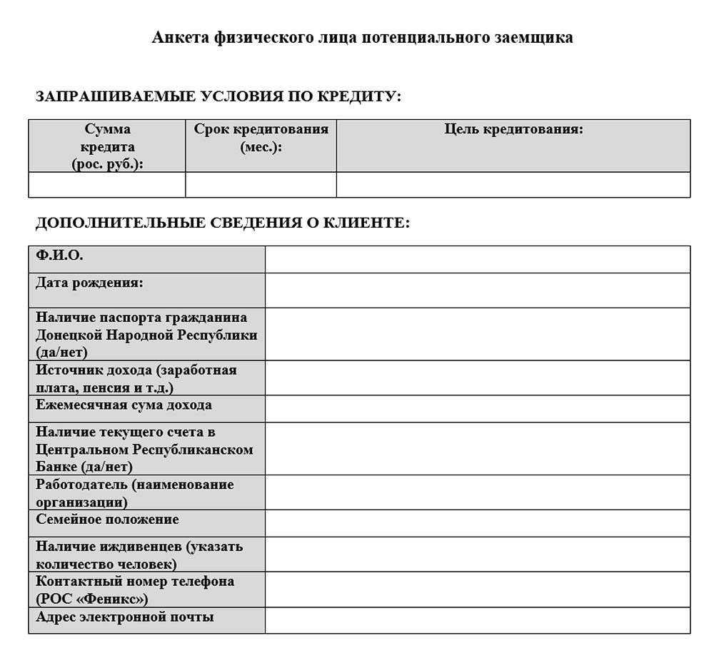 «Просим Вас заполнить анкету физического лица потенциального заемщика и направить на электронный адрес Банка credit@crb-dnr.ru», — сказано в сообщении.