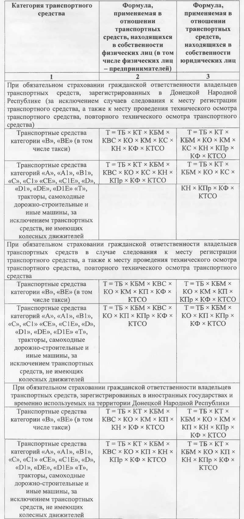 «12. Размер страховой премии, подлежащей уплате по договору (страховому полису) обязательного страхования гражданской ответственности владельцев транспортных средств (далее — Т), определяется как произведение установленной страховщиком и согласованной с ЦРБ ДНР базовой ставки страхового тарифа (далее — ТБ) и коэффициентов страховых тарифов по алгоритму: