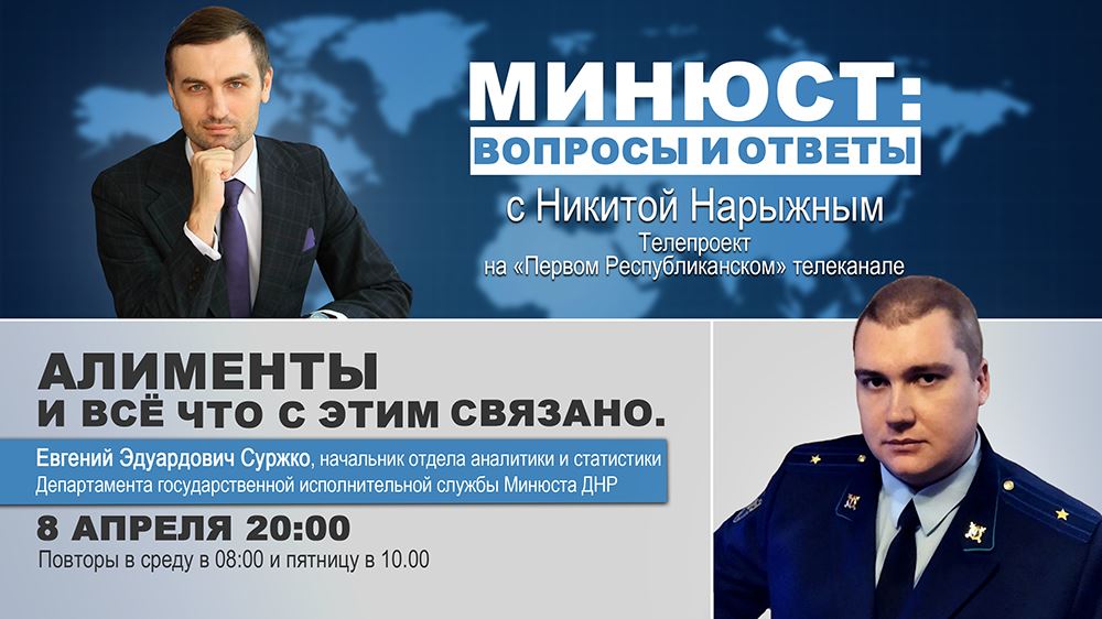 31 марта 2020 года в Министерстве юстиции Донецкой Народной Республики сообщили, что в апреле на «Первом Республиканском» телеканале начнет выходить новая программа «Минюст: вопросы и ответы». Она поможет любому жителю Республики найти для себя полезную информацию, касающуюся вопросов права и его применения.