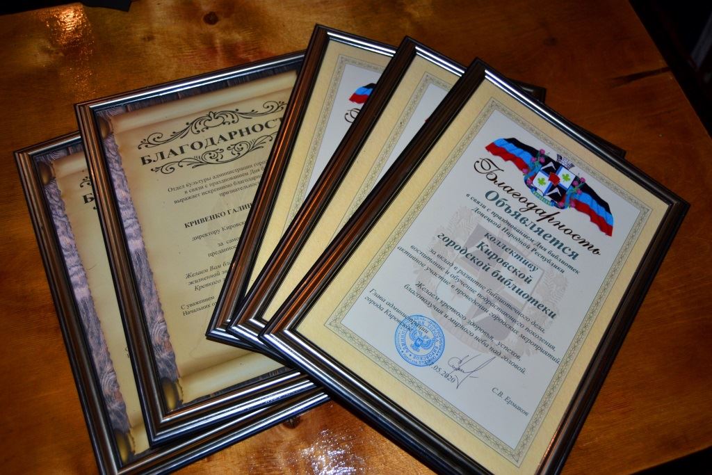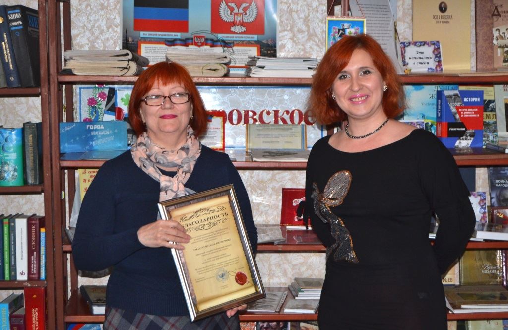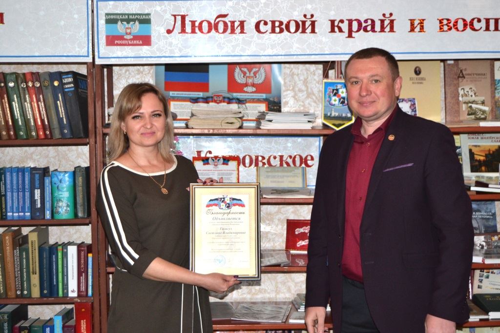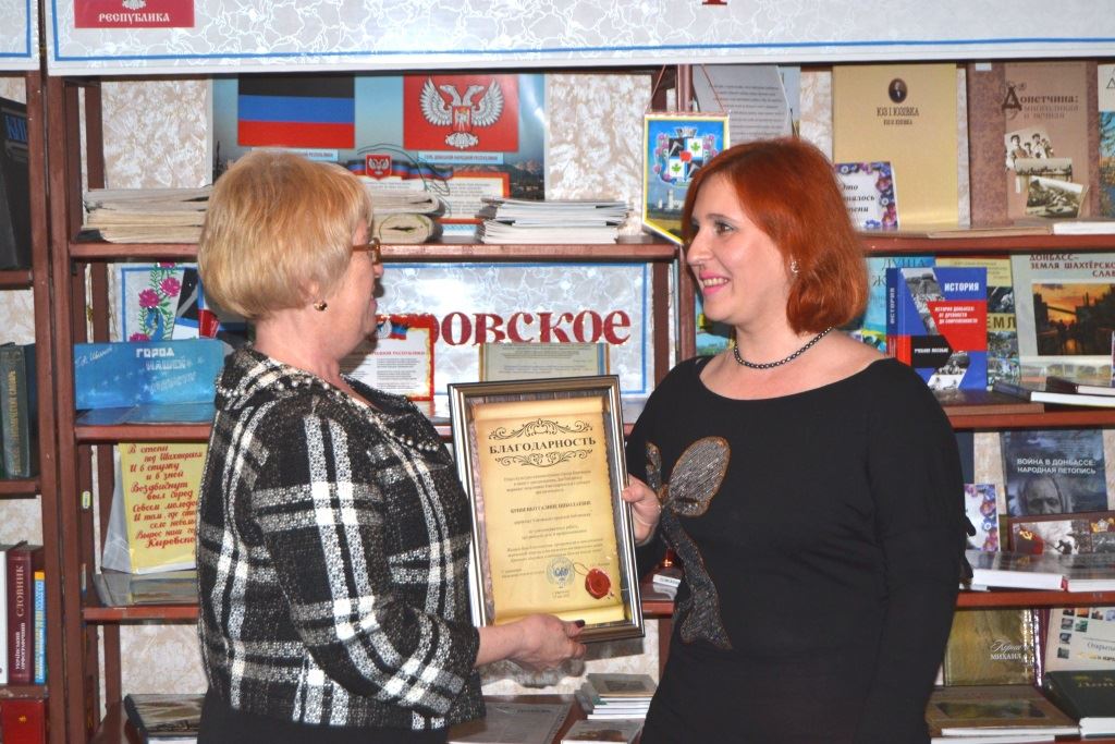 Сергей Ермаков и Ольга Языкова вручили благодарности коллективу и самым активным сотрудникам библиотеки, также были вручены подарки от Общественного Движения “Донецкая Республика”.