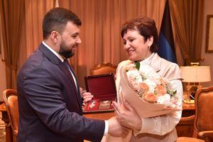 «В преддверии профессионального праздника Ваших подведомственных структур хочу Вас поздравить и вручить государственную награду – знак отличия «За заслуги перед Республикой»», – сказал Денис Пушилин.
