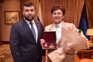 В пятницу, 19 июня, Глава Донецкой Народной Республики Денис Пушилин провел встречу с министром здравоохранения Ольгой Долгошапко и вручил ей государственную награду – знак отличия «За заслуги перед Республикой». Об этом сообщает пресс-служба Администрации Главы.