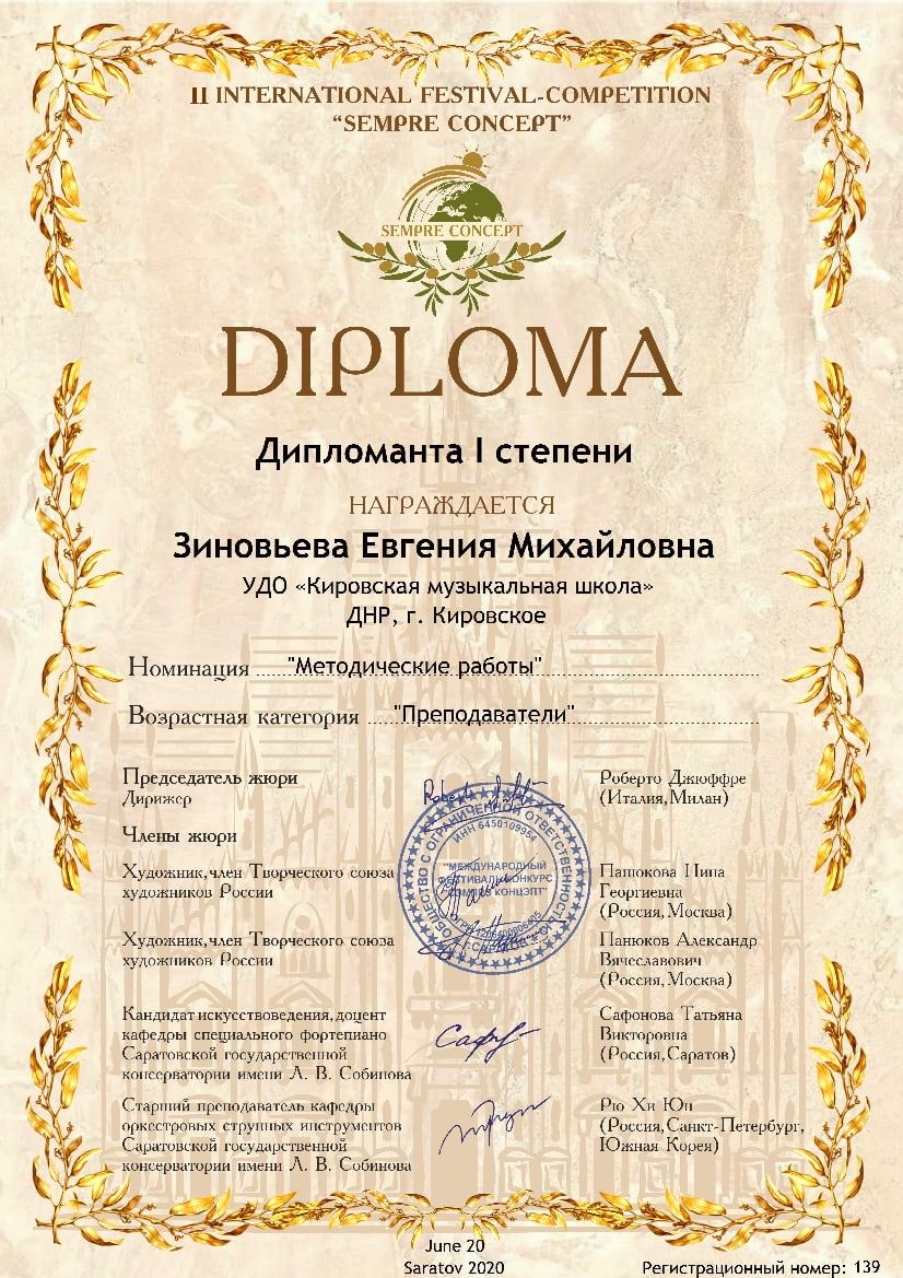 Дорогие друзья! Месяц июнь, не смотря на каникулы и уже начавшийся у педагогов отпуск, продолжает нас радовать результатами различных конкурсов, в которых принимали участие не только наши ученики, но и педагоги! И вот, по результатам II Международного конкурса ” Sempre Concept” педагог нашей Кировской музыкальной школы по классу скрипки Зиновьева Евгения Михайловна стала Дипломантом I степени в категории ” Методические работы”!