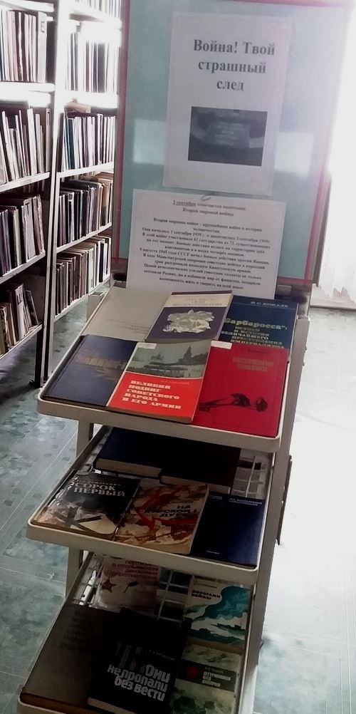 На выставке «Война! Твой страшный след», посвященной этой памятной дате, будет представлена литература о Второй мировой войне, об её итогах и уроках. Также можно будет познакомиться с литературой, посвященной капитуляции и падении Японии, предшествующим этому событию Маньчжурской и другим стратегическим наступательным операциям, проведенным Советской армией.