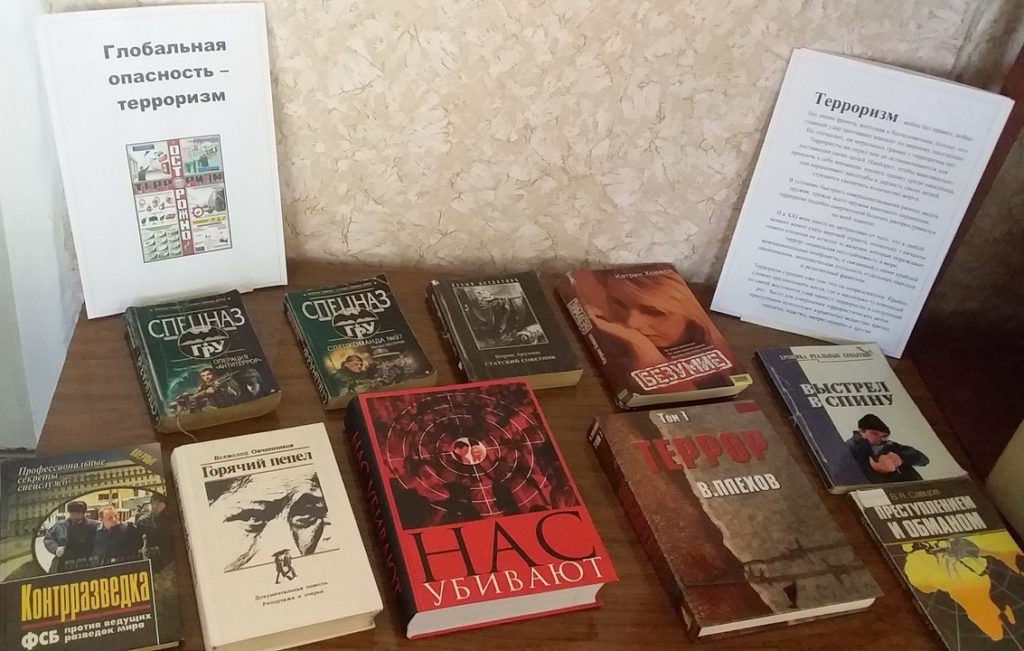 Выставка-досье «Глобальная опасность – терроризм», организованная в секторе обслуживания взрослых Кировской городской библиотеки, знакомит с изданиями, описывающими теракты в мире, хронику событий и меры борьбы с терроризмом.
