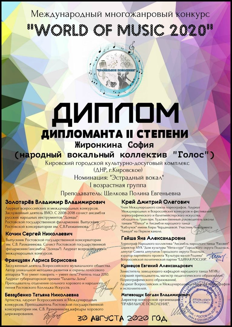 Так, 30 августа 2020 года наши вокалистки Жиронкина София, Сторожниченко Лилия и Ревва Софияприняли участие в Международном многожанровом конкурсе “World of Music 2020” (г. Ростов на Дону) и стали лауреатами и дипломантами конкурса!!! Ревва София – лауреат I степени, Сторожниченко Лиля – лауреат II степени, Жиронкина София – дипломант II степени. Замечательные результаты и отличный подарок для коллектива ко Дню Шахтера и Дню города!!! Пожелаем девчонкам новых побед и достижения новых вершин!!!