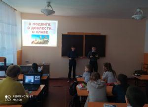 Члены клуба Александр Луценко и Даниил Петров рассказали о памятных датах военной истории: Куликовская битва, победа в которой стала символом доблести и славы; Полтавская битва, которая закончилось полной победой русских войск; Отечественная война 1812 г. между русской и французской армиями; Великая Отечественная война. Ребята внимательно посмотрели видеоряд «Исторические сражения» и ответили на вопросы викторины.