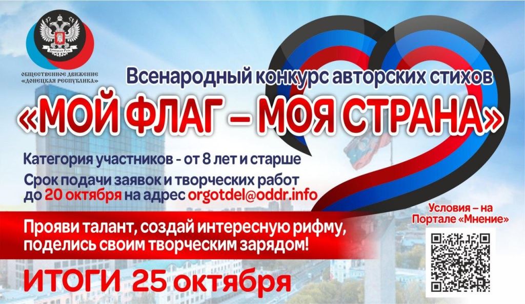 7 октября в ДНР стартовал Всенародный конкурс авторских стихов «Мой флаг – моя страна», который общественное движение «Донецкая Республика» проводит в рамках празднования Дня Государственного флага Донецкой Народной Республики.