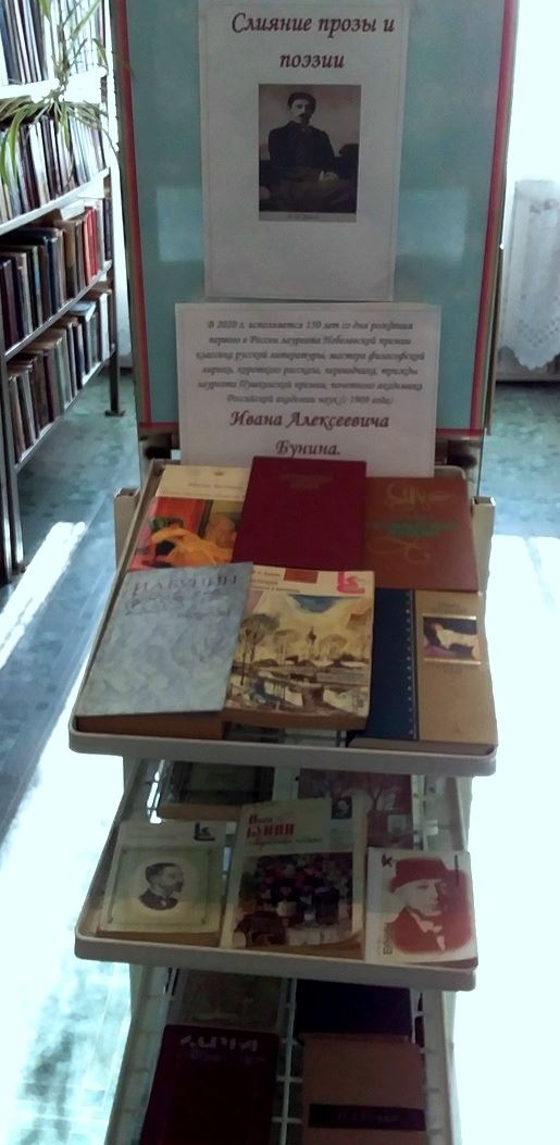 В секторе обслуживания взрослых 20 октября оформлена книжная выставка к 150-летию со дня рождения русского писателя Ивана Бунина «Слияние прозы и поэзии».