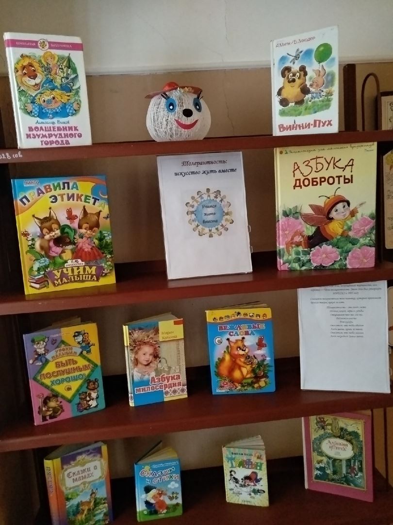 В Кировской городской библиотеке в секторе обслуживания детей оформлен просмотр литературы «Толерантность: искусство жить вместе», посвященный Международному дню толерантности. Представлены книги, которые учат детей любви и терпимости, умению ладить друг с другом, честности, бескорыстию.