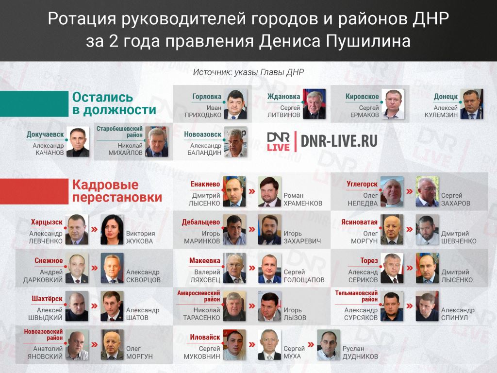 В результате Денис Пушилин сменил руководителей администраций четырех городов и двух районов: Шахтёрска, Тореза, Снежного, Енакиево, Амросиевского и Тельмановского районов.