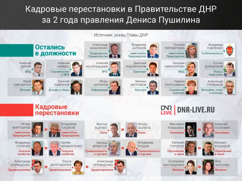 Больше всего кадровых перестановок произошло в 2019 году. Помимо этого, в прошлом году были утверждены в должностях глава администрации Донецка Алексей Кулемзин, глава администрации Кировское Сергей Ермаков, глава администрации Докучаевска Александр Качанов и глава администрации Старобешевского района Николай Михайлов.