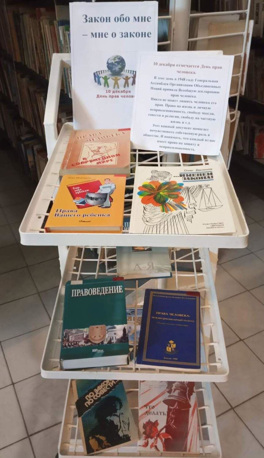 Ко Дню прав человека в Кировской городской библиотеке в читальном зале оформлена выставка-совет «В мире права и закона», в секторе обслуживания детей – выставка-рекомендация «Закон обо мне – мне о законе». Материалы, представлены на выставках помогут в изучении своих прав и обязанностей, познакомят с важными законодательными и правовыми актами, раскроют соотношение и взаимодействие прав человека и гражданина с государством, с деятельностью органов государственной власти.