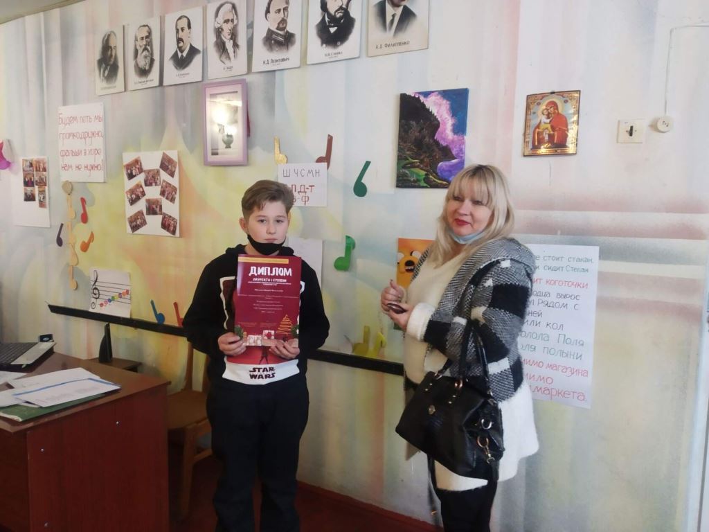 Неклюдов Богдан стал Лауреатом I степени, а Михайлечко Альбина стала Лауреатом II степени! Ребята занимаются в классе Зиновьевой Е.М.! Директор школы с радостью вручила им заслуженные грамоты! В этом же конкурсе Эль-Лух Арсений (класс преподавателя Садовниковой Л.В.) также стал Лауреатом I степени! Светлана Григорьевна при вручении Диплома Лауреата произнесла Арсению напутственные слова с пожеланием дальнейших успехов!