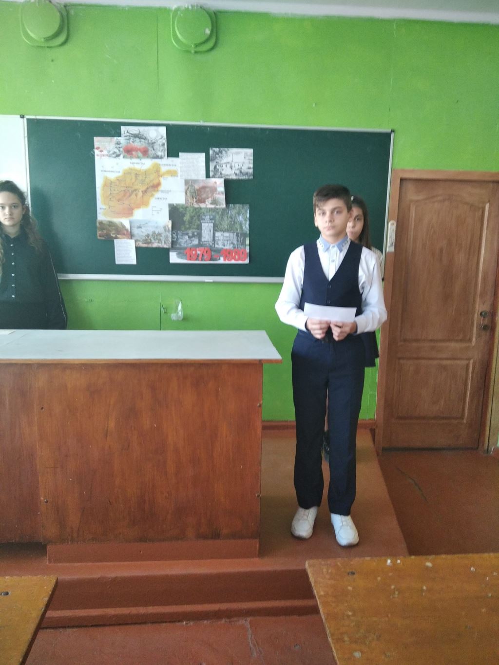 15 февраля 2021 года в рамках патриотического воспитания в 7-А классе МУНИЦИПАЛЬНОГО ОБЩЕОБРАЗОВАТЕЛЬНОГО УЧРЕЖДЕНИЯ «СРЕДНЯЯ ШКОЛА № 2 ГОРОДА КИРОВСКОЕ» было проведено внеклассное мероприятие, посвящённое 32-й годовщине вывода советских войск из Афганистана – «Афганистан – живая память». В форме устного журнала ребята отметили особенности афганской войны, читали стихи и отрывки из писем воинов-интернационалистов, почтили память погибших минутой молчания. Продуктом данного мероприятия стал коллаж, собранный ребятами.