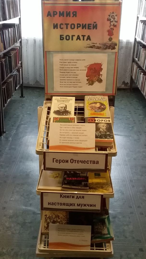 Яркая по своему оформлению, очень значимая по смыслу, книжная выставка охватывает исторические моменты возникновения Советской Армии. На выставке представлены книги о великих русских полководцах и адмиралах, великих сражениях на море и на суше, а также книги об истории становления русского воинства и воинских ритуалах.