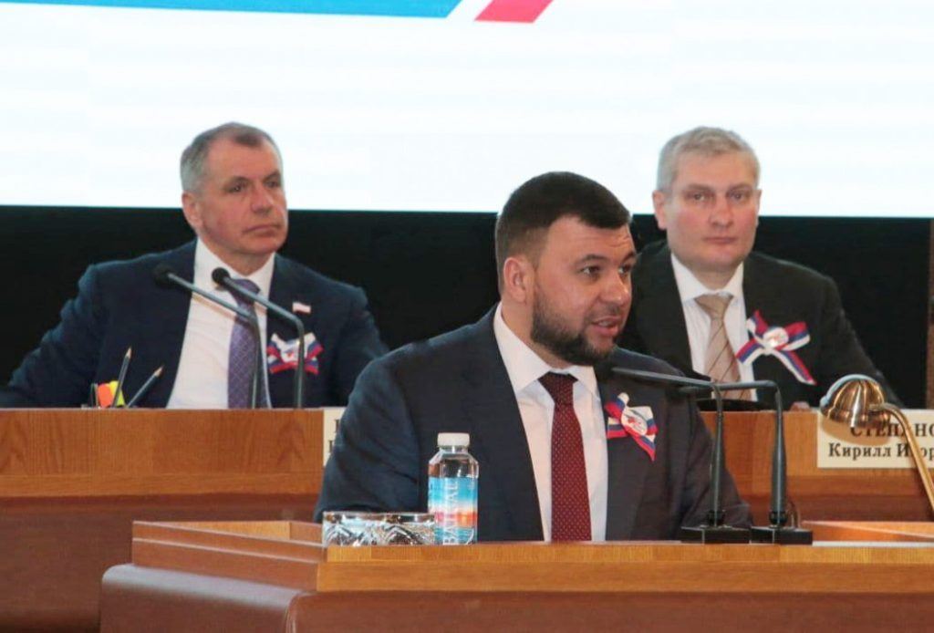 «Сегодня на переднем крае защитников Русского мира находятся граждане Донецкой и Луганской народных республик. Нам было легче, признаемся честно. Потому что у нас все проходило мирным путем. Они защищают себя с оружием в руках. Ценою тысяч жизней. При этом они защищают не только себя, они защищают соотечественников, проживающих за рубежом. Они защищают нас — граждан Российской Федерации. Я в лице Дениса Владимировича хочу выразить огромную благодарность гражданам Донбасса за их стремление к свободе, за их мужество и героизм.