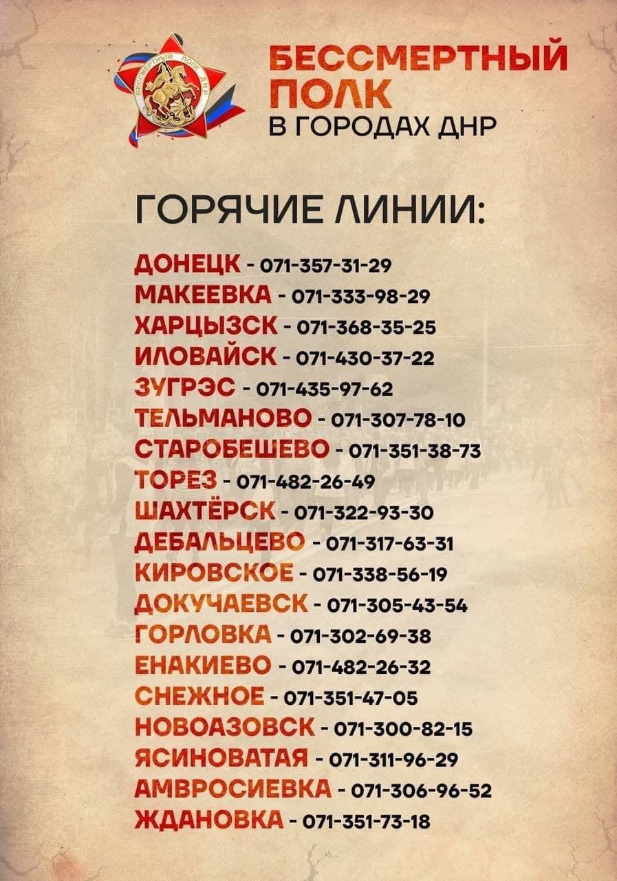 «Бессмертный полк» − международная патриотическая акция, которая проводится для увековечивания памяти участников и жертв Великой Отечественной войны. В каждом городе и районе Донецкой Народной Республики будет проводиться шествие. Любой желающий сможет прийти с портретом своего Героя.