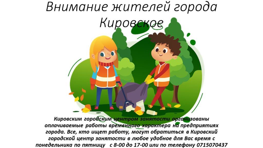 За дополнительной информацией можно обратиться в Кировский городской центр занятости по адресу: г.Кировское, ул.Шевченко,9 (кабинет № 1) или по телефонам 6-10-24, 0715070437.