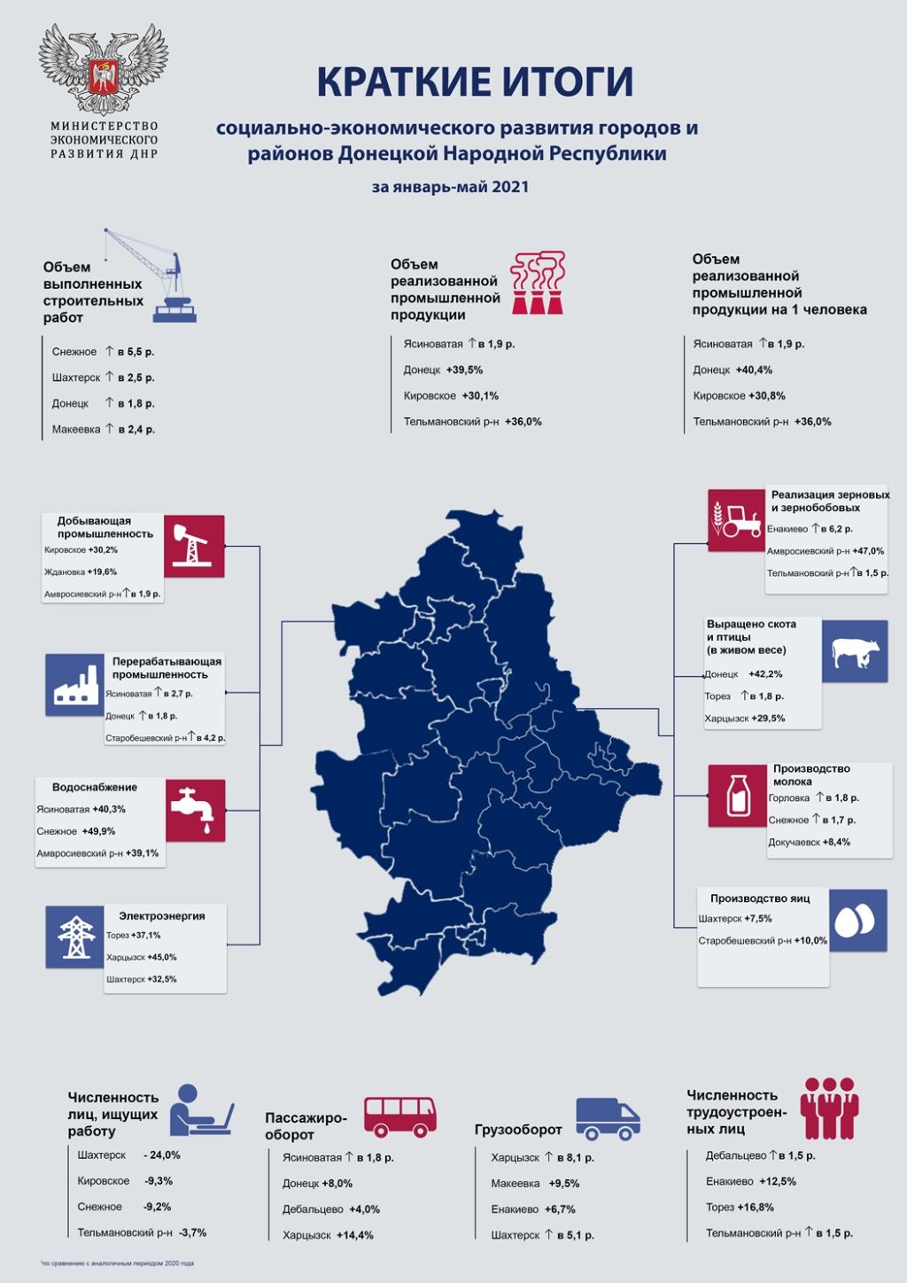 Развитие городов и районов Республики. Январь – май 2021 года Posted on08.07.2021Authoradmin1    156 В Минэкономразвития подведены краткие итоги социально-экономического развития городов и районов Донецкой Народной Республики за январь-май 2021 года.