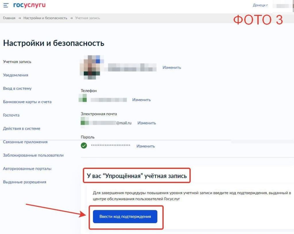 4. Он перешел в раздел «Настройки и безопасность», и внизу страницы увидел, что статус его записи ✅ «Упрощенная учетная запись». Нажал «Ввести код подтверждения» (Фото 3).