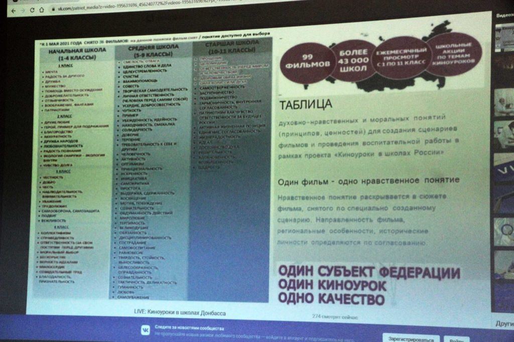 «Проект «Киноуроки в школах России» реализуется с 2016 года. Для нас важно, что теперь образовательные организации Донецкой Народной Республики смогут принять участие в нем. Пробные шаги были сделаны к этому у нас еще в 2019 году, когда в Республику была передана часть киноуроков для использования в наших школах. Пилотный проект показал себя с лучшей стороны.