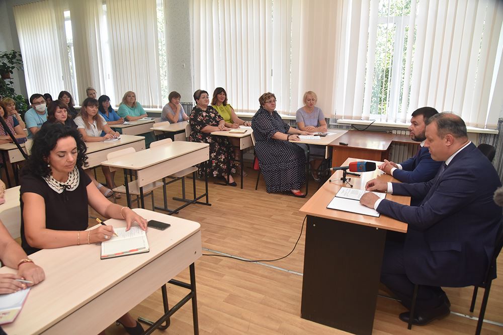 Сегодня, 30 августа, в преддверии начала нового учебного года Глава Донецкой Народной Республики Денис Пушилин провел рабочую встречу с руководителями общеобразовательных учреждений Донецка и, непосредственно, с педагогическими работниками. Как сообщает корреспондент официального сайта ДНР, участники встречи обсудили задачи, запланированные к реализации в будущем учебном году. Прежде всего, это продолжение курса на интеграцию в образовательное пространство Российской Федерации, дальнейшее внедрение новых государственных образовательных стандартов и другие. Мероприятие прошло на базе Донецкой специализированной школы с углубленным изучением гуманитарных дисциплин № 18, которая расположена Ворошиловском районе столицы Республики.