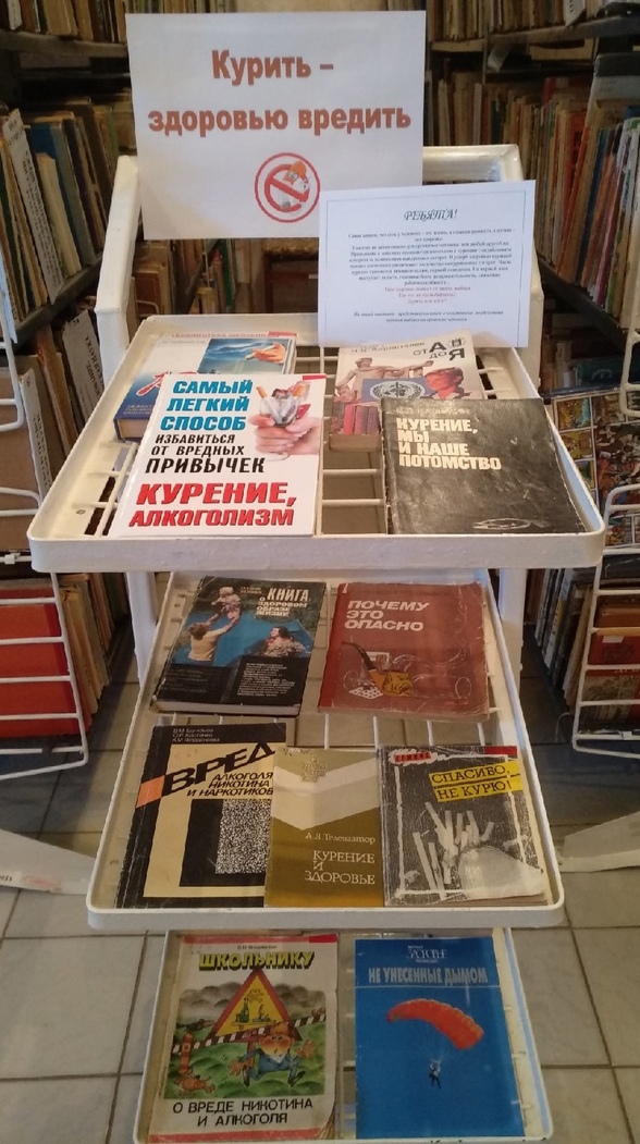 Библиотекари сектора обслуживания детей Кировской городской библиотеки приглашают читателей посетить иллюстративную выставку «Курить – здоровью вредить». Книги, представленные на выставке, знакомят с историей появления табака и вредной привычки табакокурения, со страшными последствиями действия никотина на организм человека, особенно подростков. Здесь также можно найти полезную информацию о том, как бороться с вредной привычкой и вести здоровый образ жизни.