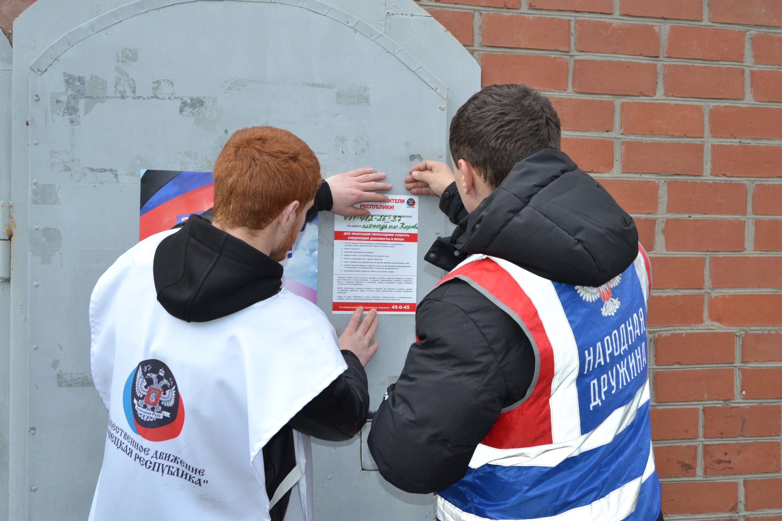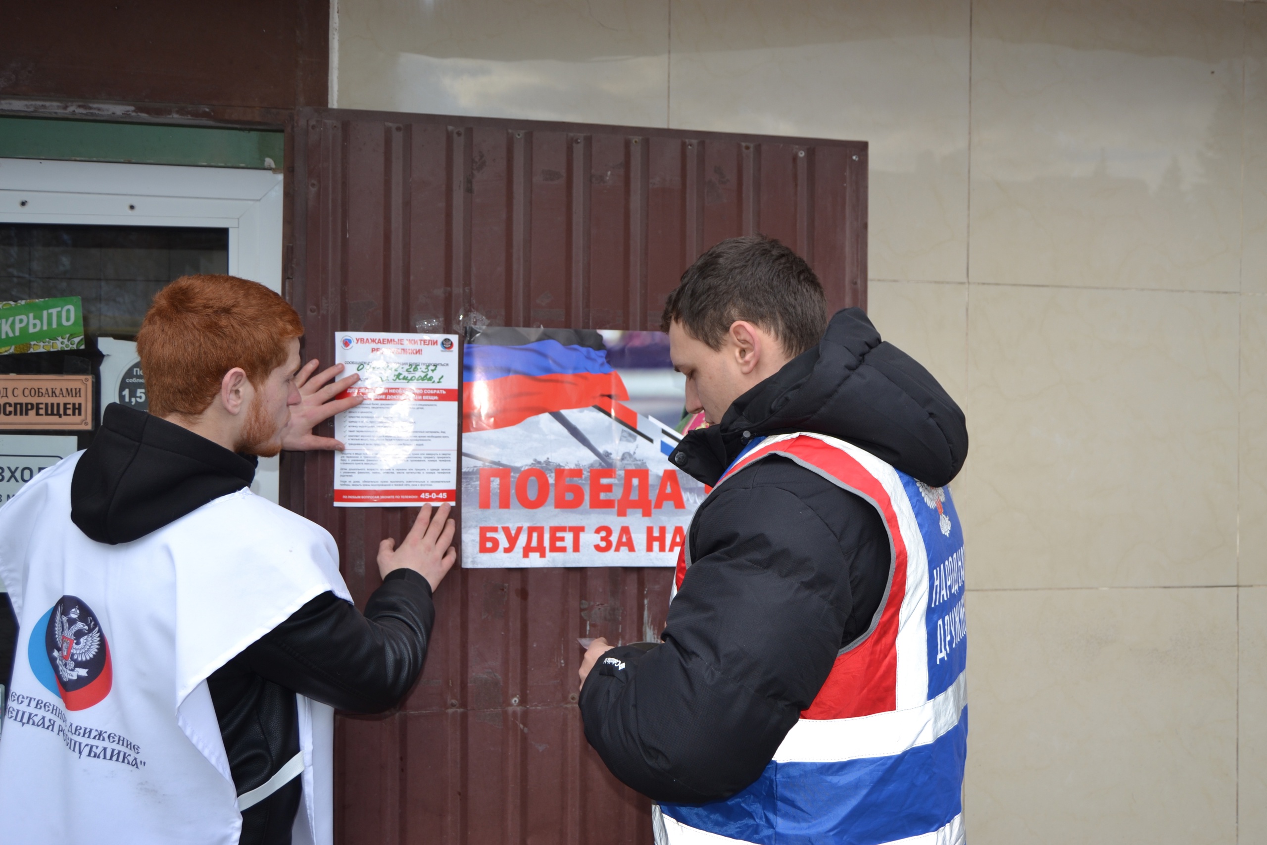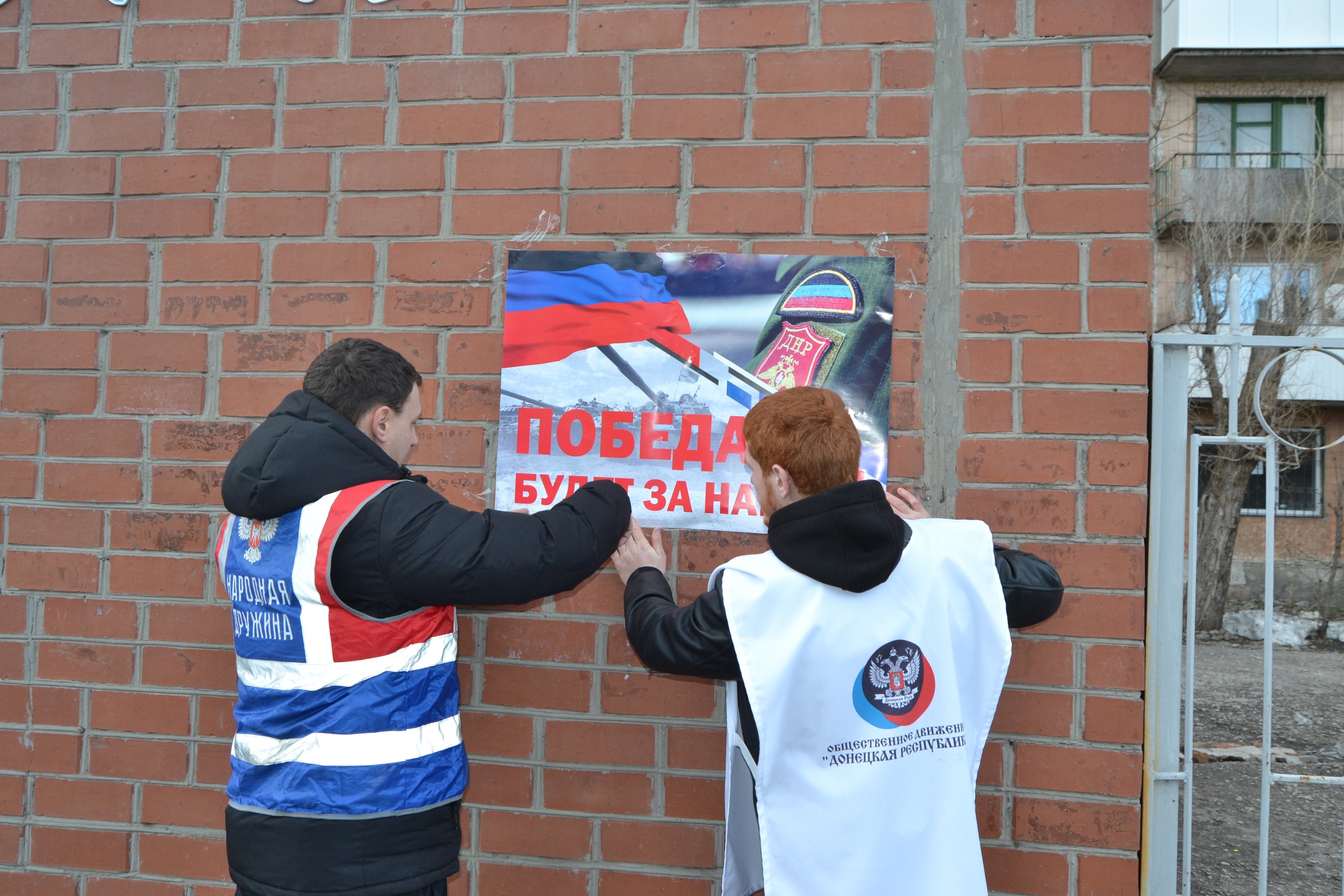 Активисты местного отделения Общественного Движения «Донецкая Республика» и Народные дружинники города Кировское присоединились к народной акции «Я остаюсь, чтобы бороться». Ребята размещали на улицах плакаты с призывами к мужчинам, готовым защищать свою Родину с оружием в руках.
