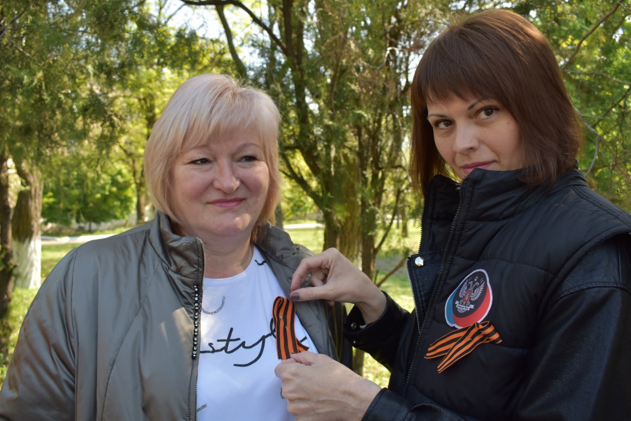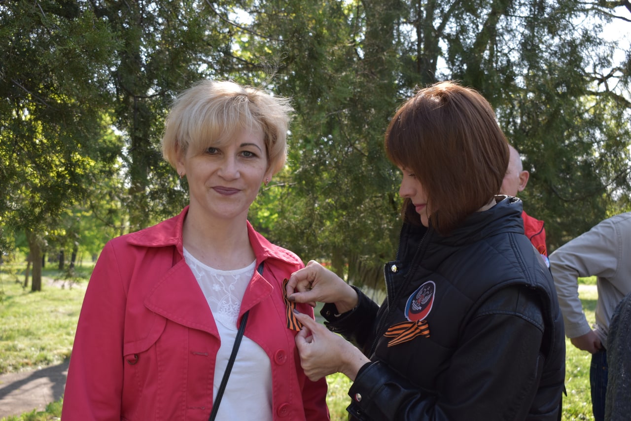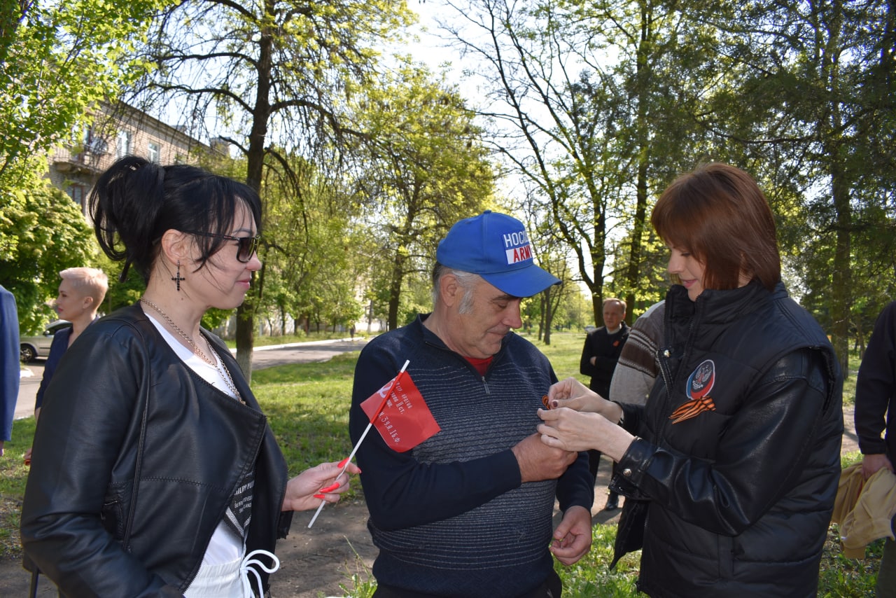 Активисты Общественного Движения «Донецкая Республика» раздавали георгиевские ленты и флажки ко Дню Победы.
