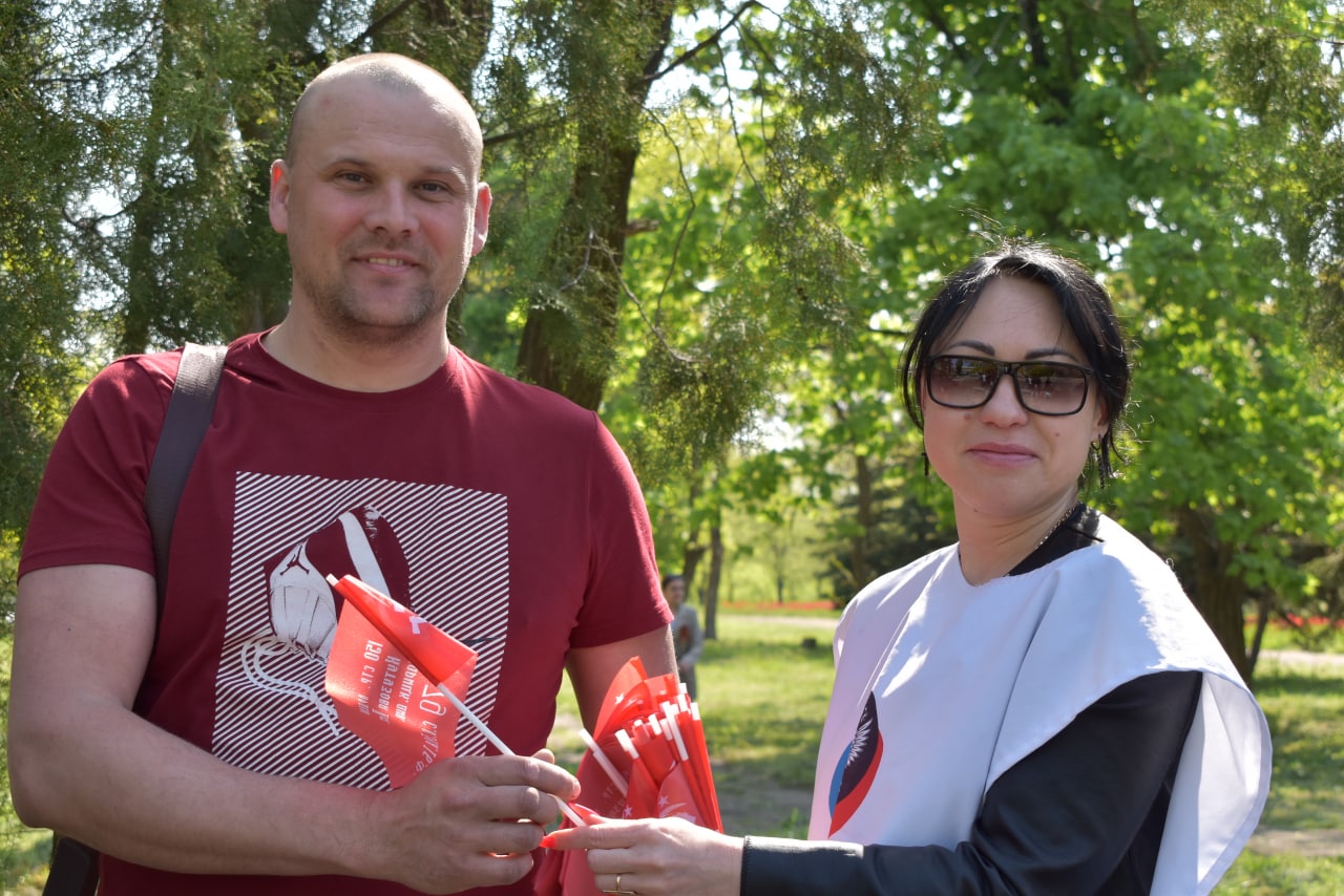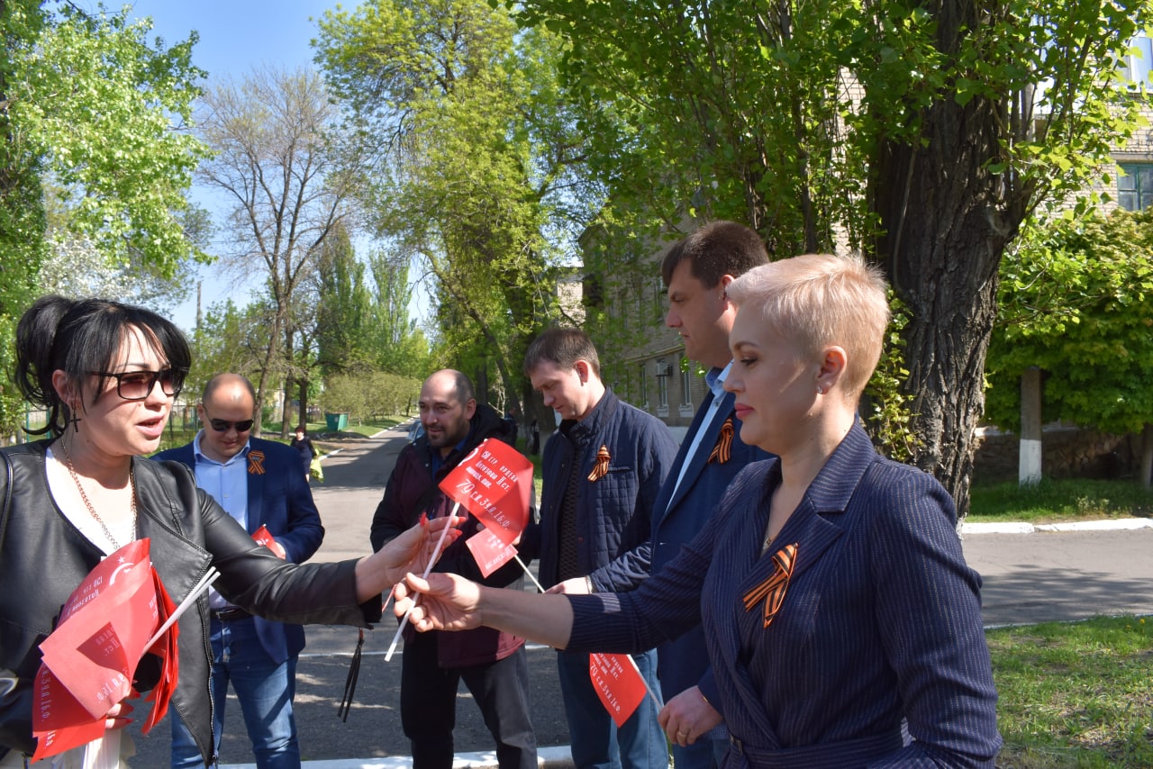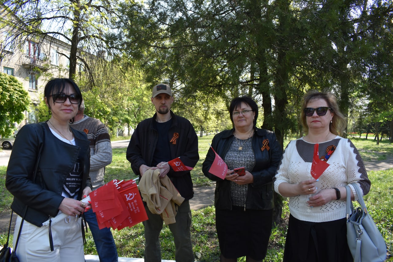 Активисты Общественного Движения «Донецкая Республика» раздавали георгиевские ленты и флажки ко Дню Победы.