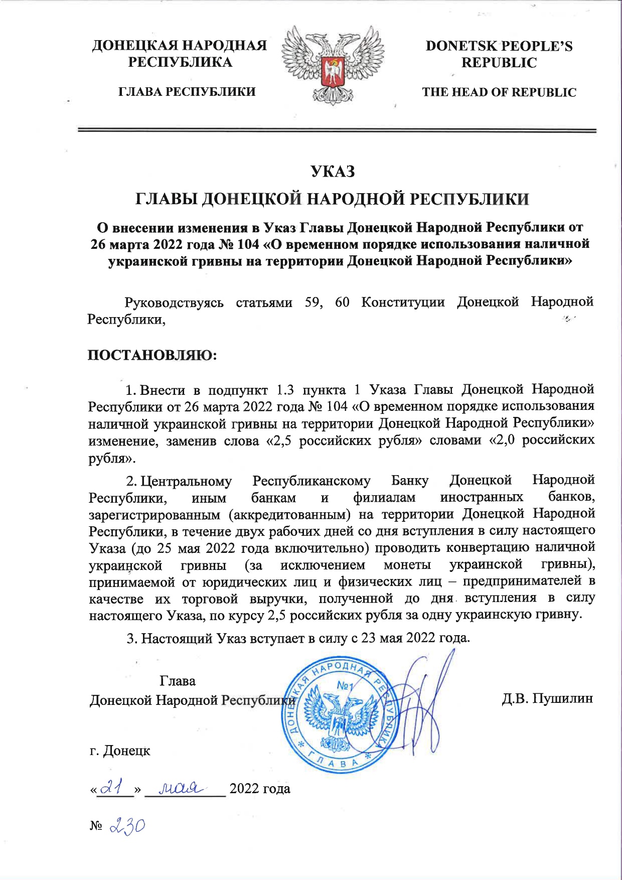 Указом Главы ДНР №230 от 21 мая 2022 года внесено изменение в Указ Главы Донецкой Народной Республики от 26 марта 2022 года №104 «О временном порядке использования наличной украинской гривны на территории Донецкой Народной Республики».