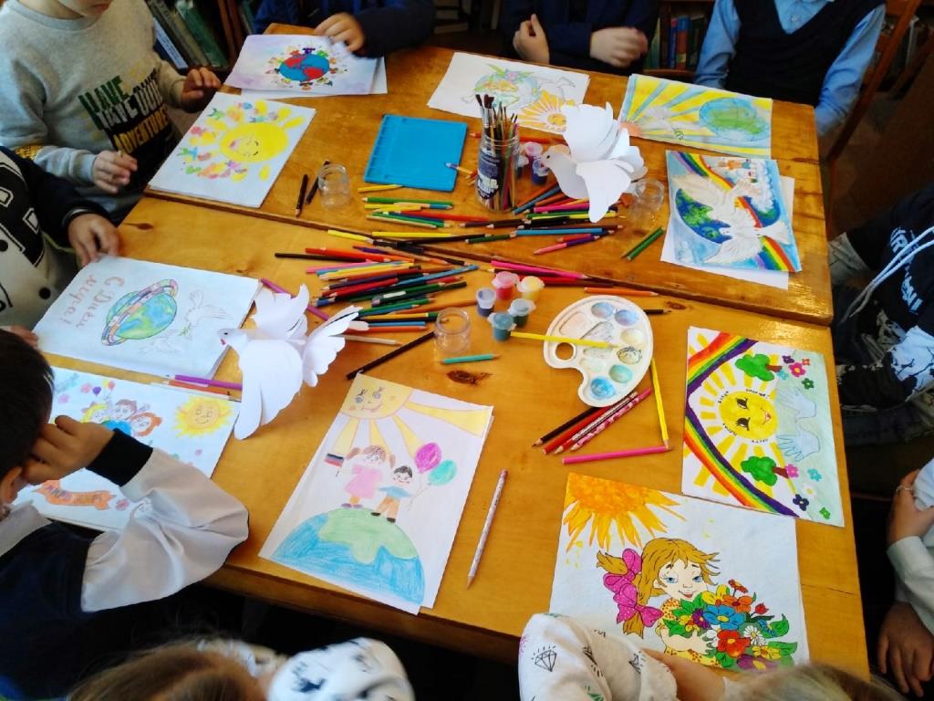 20 сентября в Кировской городской библиотеке прошёл конкурс рисунков «Пусть всегда будет солнце», посвящённый Международному Дню Мира. В своём мастерстве рисования соревновались юные художники учащиеся 3-А класса МОУ “СШ № 2 города Кировское” и учащихся 2-В класса МОУ “СШ № 1 города Кировское”. Участникам было предложено изобразить всю красоту окружающего мира на листе бумаги. Многие рисунки отличались ярким воображением, полётом фантазии и оригинальностью. Ребятам, участвующим в конкурсе, предлагалось нарисовать то, что у них ассоциируется со словом «мир»: ясное солнышко, зелёную травку, безоблачное небо. В своих рисунках дети показали, как они видят мир и чувствуют его. Конечно, всем нам хотелось бы жить в мире, поэтому в своих рисунках ребята рисовали, что они не хотят войны.
