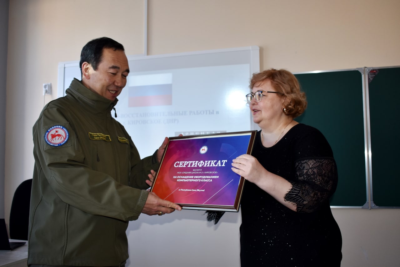 Айсен Николаев передал начальнику отдела образования города Кировское Ирине Арзамасцевой Сертификат для оборудования компьютерного класса в средней школе №3. Работы в этой школе запланированы на 2023-2024 годы и в первую очередь включают в себя анализ почвы.