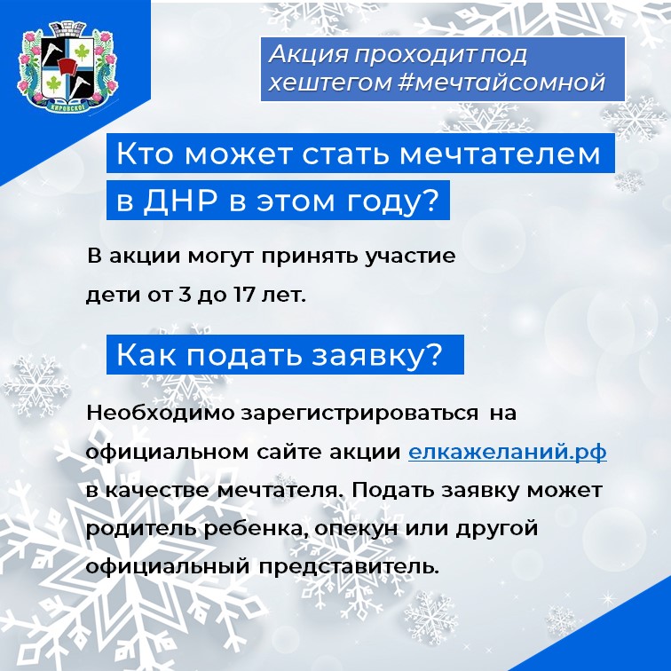 В этом году дети из ДНР могут принять участие во Всероссийской благотворительной акции «Ёлка желаний». На специальном сайте они могут рассказать о своей мечте, и, возможно, найдутся «волшебники», желающие её исполнить.