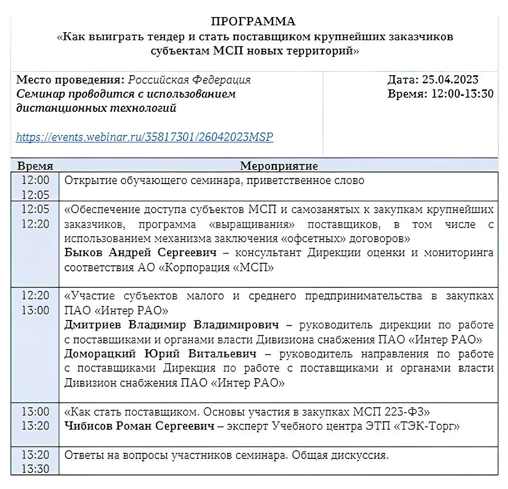 Минэкономразвития ДНР сообщает о проведении АО «Корпорация «МСП» бесплатного семинара по вопросу участия субъектов МСП Донецкой Народной Республики в закупках в соответствии с Федеральным законом от 18 июля 2011 г. № 223-Ф3 «О закупках товаров, работ, услуг отдельными видами юридических лиц».