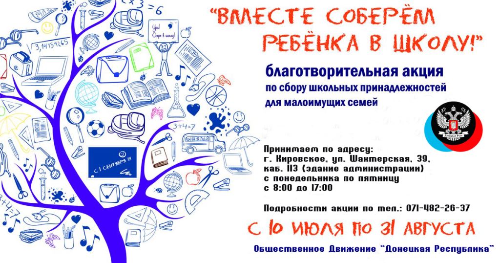 Кировское отделение Общественного Движения «Донецкая Республика» проводит сезонную благотворительную акцию «Вместе соберём ребёнка в школу» Все желающие принять участие в акции могут принести в местное Читать далее …